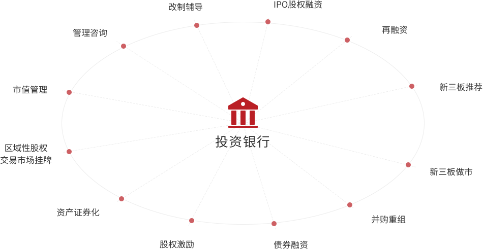 投资银行部投资银行业务是万和证券树立品牌的核心业务。万和证券投资银行的定位是以市场化业务为导向,以债券、新三板业务为中心,大力发展IPO及其他投行业务。万和证券投资银行立足于服务股东优势,深耕股东和深圳国资体系内的业务;基于全业务链服务优势,投资银行以新三板为基础开展挂牌、做市和融资等各项业务,并从中孵化潜在的IPO项目和并购重组项目,在资源共享、业务协调的基础上逐步推进大投行模式;同时,深入研究资本市场改革可能带来的市场化发行产生的股票销售环节的业务机会,组建一个完善的销售团队,使承销能力成为投资银行的一个显著特色。